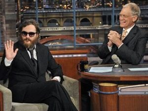 مصاحبه جنجالی واکین فینیکس با دیوید لترمن در سال ۲۰۰۹، زمانی اتفاق افتاد که او در قالب شخصیت ساختگی فیلم مستند نمایشیاش با عنوان«من هنوز اینجا هستم»، در برنامه حاضر شد. ظاهر ژولیده، رفتارهای سردرگم و پاسخهای مبهم او، موجب سردرگمی مجری و تماشاگران شد و این تصور را ایجاد کرد که فینیکس دچار فروپاشی روانی شده است. در حالی که این حضور عجیب در واقع بخشی از یک پروژه هنری برای نمایش مرز میان واقعیت و اجرا بود، اما تا مدتها به عنوان یکی از عجیبترین و ناراحتکنندهترین مصاحبههای تاریخ تلویزیون شناخته میشد. بخشهایی از این مصاحبه بعدها بهعنوان بخشی از روایت فیلم مورد استفاده قرار گرفت.